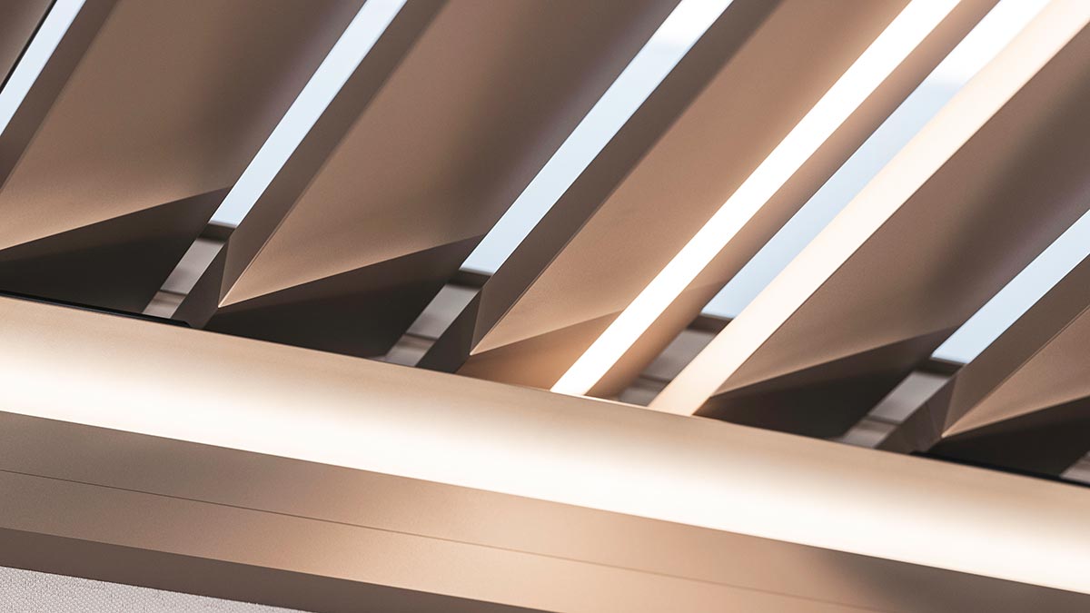 Wie der Name schon sagt: Ein Lamellendach besteht aus verstellbaren Lamellen. Diese lassen sich bis zu 150 Grad neigen – je nachdem, ob Sie volle Sonne, sanftes Licht oder angenehmen Schatten wünschen. Durch die richtige Neigung entsteht ein ideales Klima, denn warme Luft steigt nach oben, während Sie im Schatten entspannen.