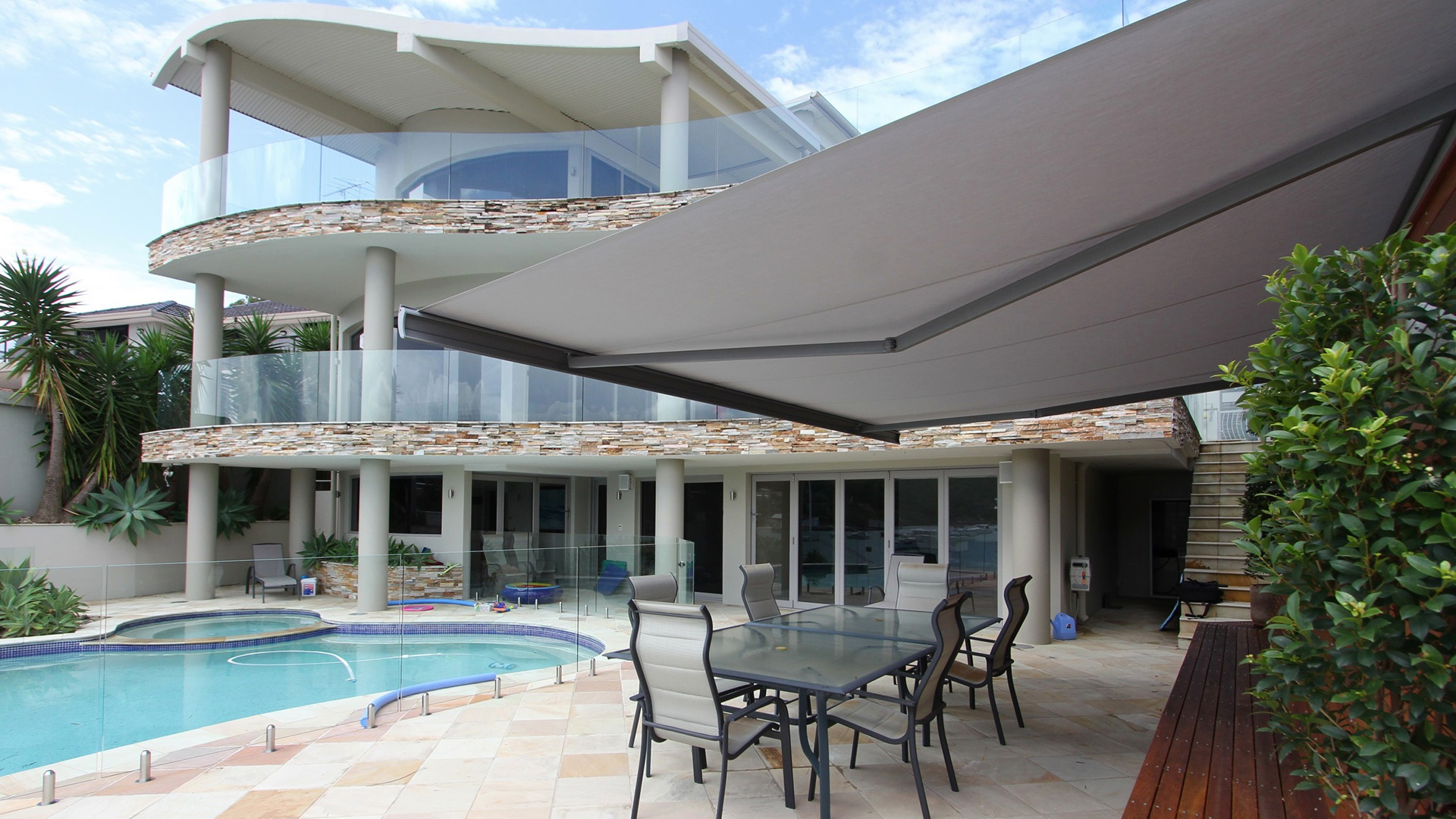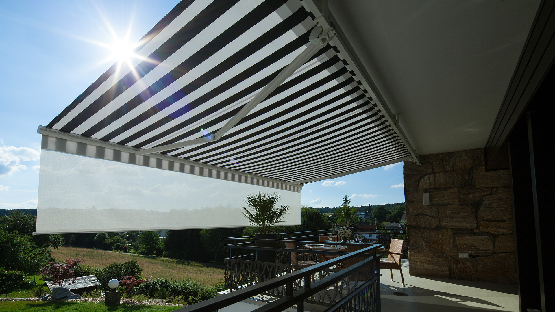 Sehr große Abmessungen lieferbar, auch freistehend. Markisen als Sonnen- und Wetterschutz