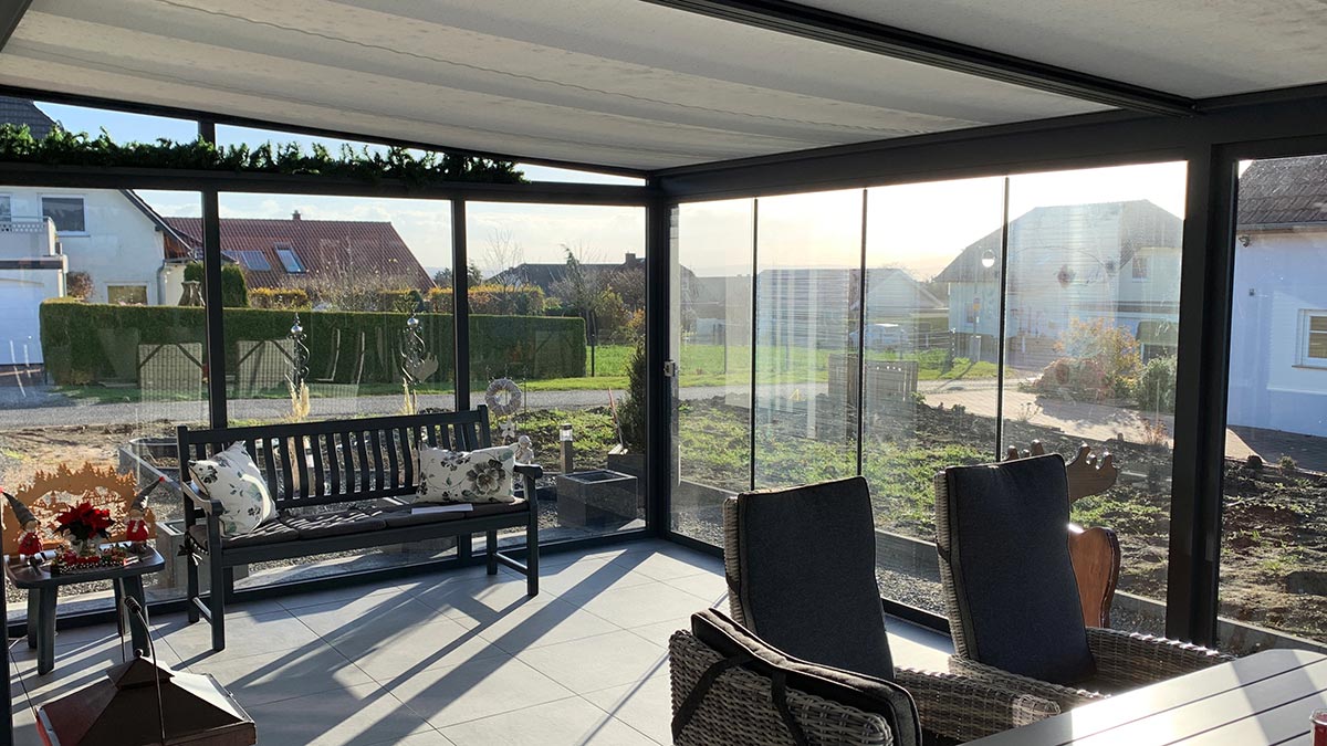 Sehr filigrane Konstruktion. Lounge-Systeme ohne sichtbare Dachneigung. Auch als Sommergarten Plus lieferbar